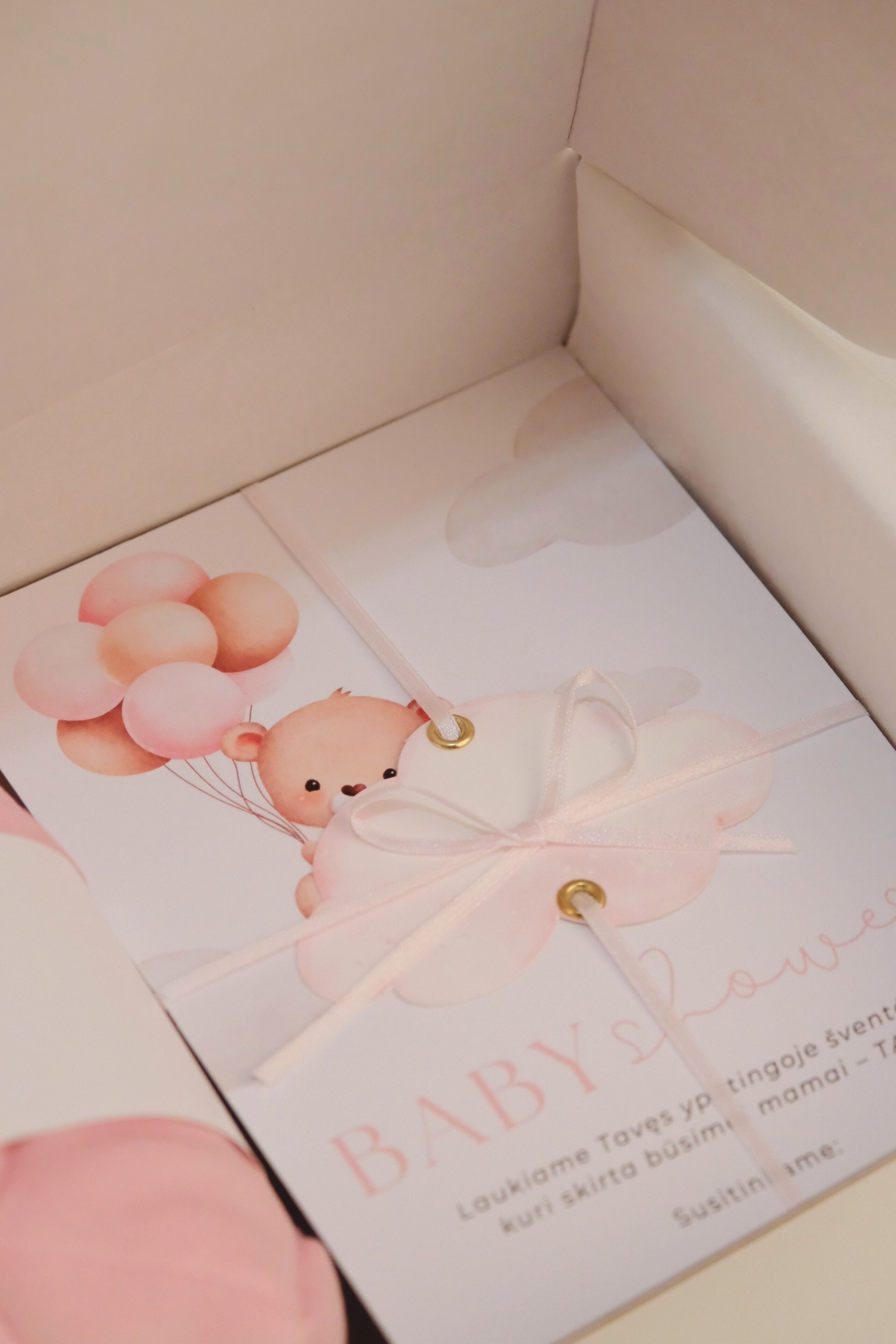 Kvietime galima įrašyti būsimos mamos vardą ir šventės vietą. Tai galite padaryti patys, arba pasirinkti, kad dėžutė Jus pasiektų jau pilnai paruošta – su užrašytu vardu ir lokacija. Tokiu atveju tereikia užpildyti šiuos duomenis atliekant užsakymą, o mes pasirūpinsime, kad dovana būtų paruošta iki smulkiausių detalių.