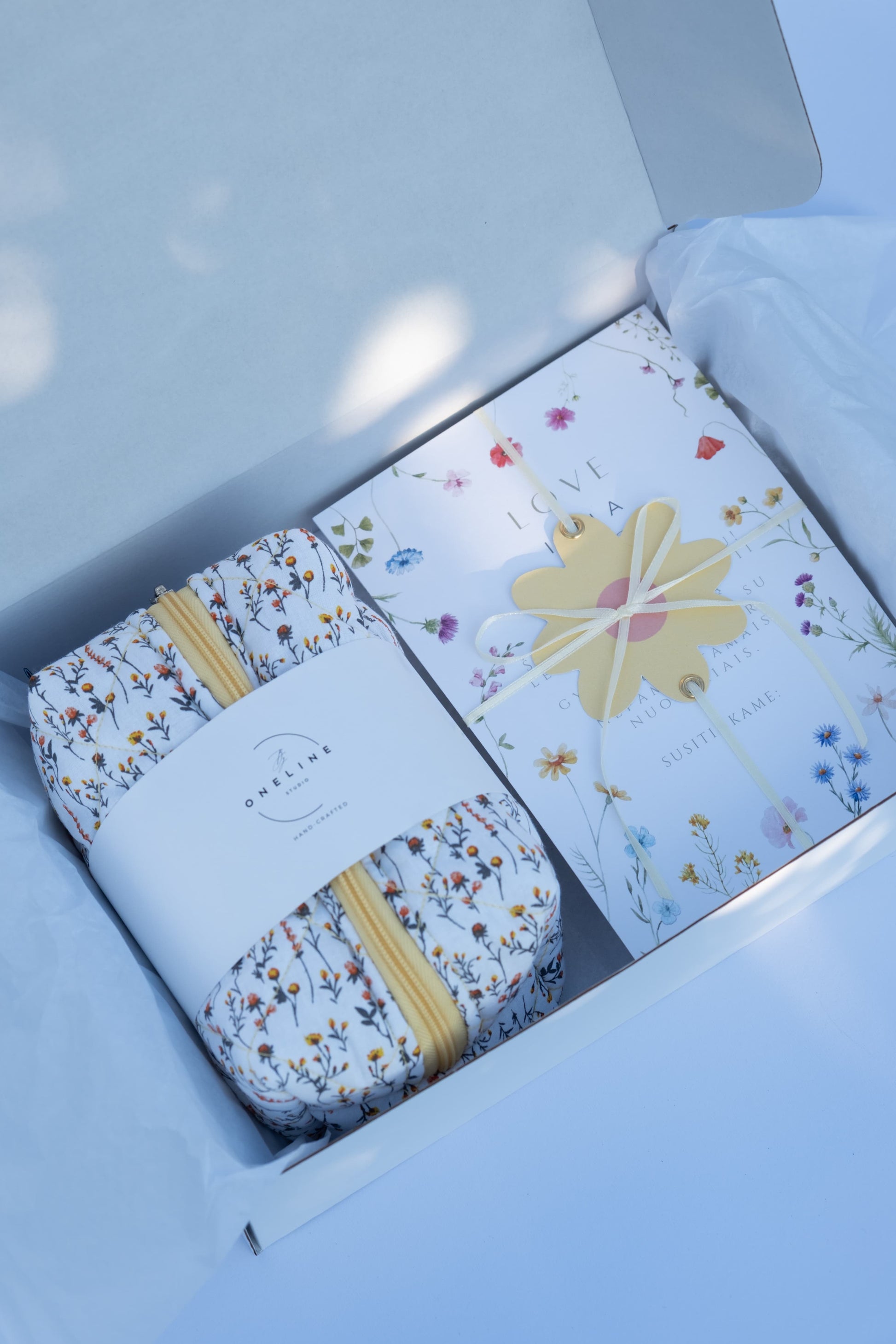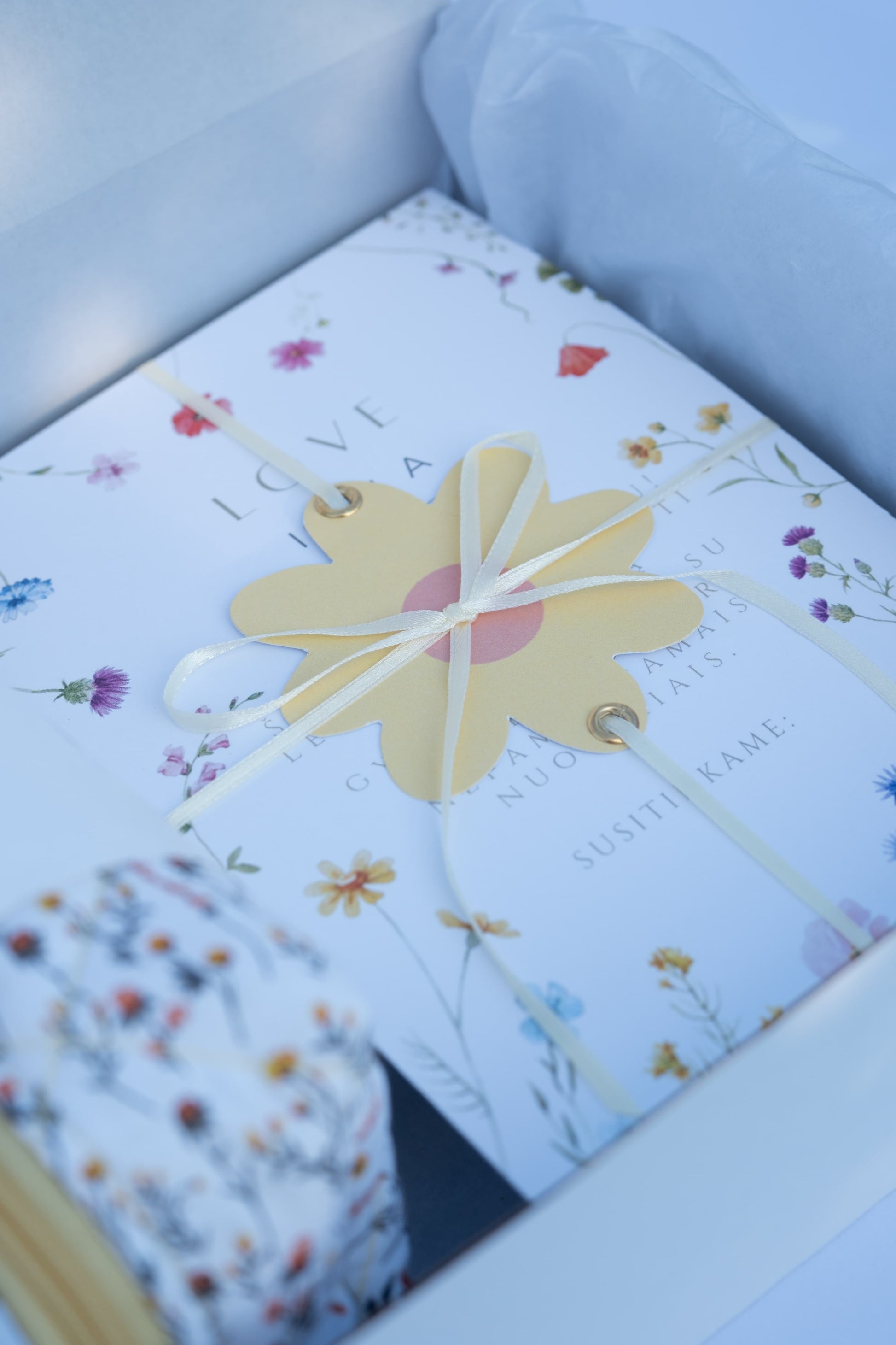 Šioje dėžutėje – gėlėta, rankų darbo kosmetinė, šviesus kvietimas ir specialiai šiai progai sukurta priesaika. Draugės pačios įrašo nuotakos vardą ir šventės vietą – kad viskas būtų asmeniška ir tikra.